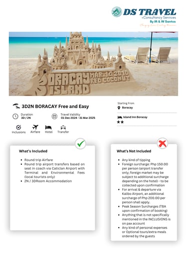B-O-R-A-C-A-Y with its sugary and powdery white sand beaches is still the reigning top destination in the Philippines. It is a place where you can relax, unwind, and let go. With its abundance of natural attractions and leisure activities to choose from, Boracay Island sure is fit for all age groups of tourists.