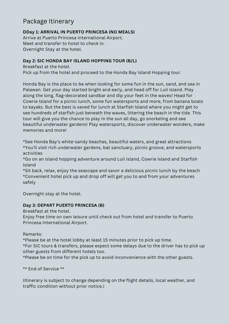Puerto Princesa's Honda Bay offers white sand beaches and marine life-rich islands, making it a popular destination for beach lovers. Island-hopping tours can take visitors to Cowrie Island, Luli Island, and Starfish Island, each offering unique experiences. Cowrie Island offers buffet lunch, cabanas, and massage areas, while Luli Island is a sandbar with a lagoon and diving board. Starfish Island is known for its diverse starfish population.