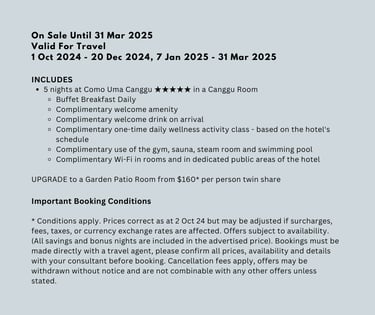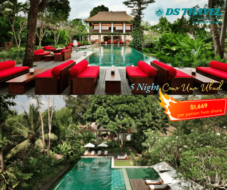 Uma Ubud, Bali's arts and culture hub, offers sun-filled villas with private pools and traditional Indonesian charm. The resort features 46 luxury suites, landscaped courtyards, and infinity plunge pools, with two world-class restaurants and a holistic wellness retreat at COMO Shambala Retreat.