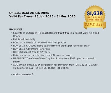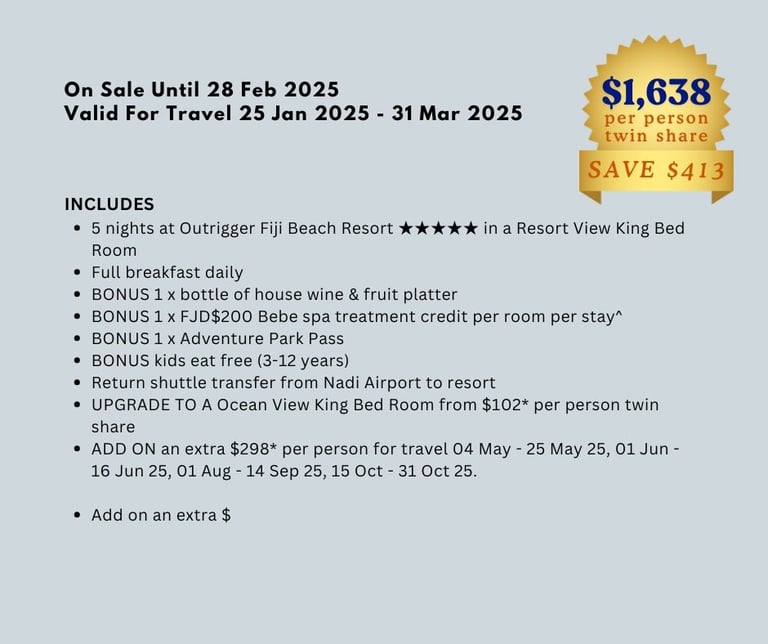 Outrigger Fiji Beach Resort, located in Coral Coast, Fiji, offers newly renovated accommodations with stunning views, including contemporary rooms and traditional Fijian-style thatched plantations.