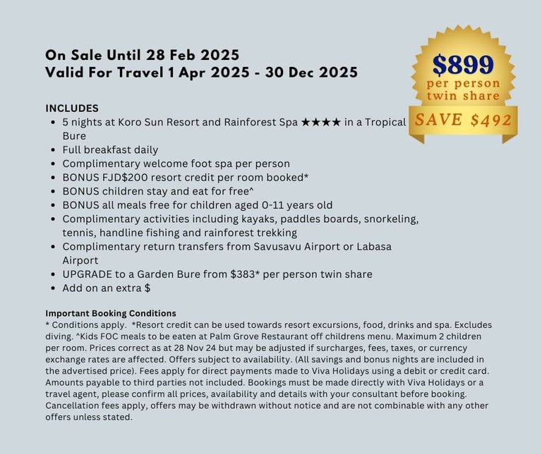 Koro Sun Resort & Rainforest Spa, situated in Vanua Levu's 160-acre sanctuary, offers a warm, tropical experience with Fijian hospitality and clear waters.