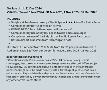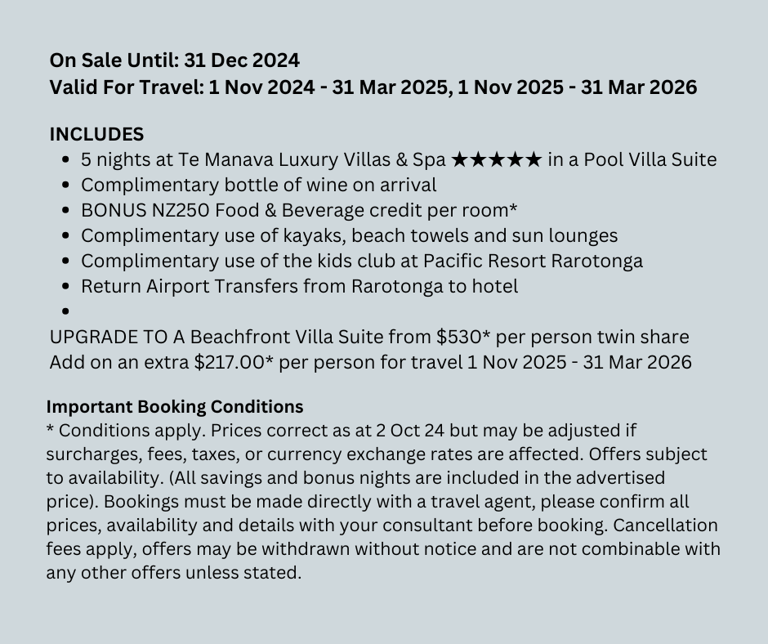 Te Manava Luxury Villas and Spa offers 13 self-contained villas with one, two, or three bedrooms, perfect for families, couples, or romantic getaways, situated on Muri Beach's sands and overlooking a lagoon.