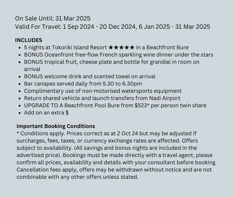 Tokoriki is a luxurious island resort with 8 Beachfront Bures, 18 Beachfront Pool Bures, 7 Beachfront Pool Villas, and 3 Pool Villas, accommodating up to 72 guests. Enjoy romantic beach vacations, spa treatments, beach picnics, diving, snorkeling, tennis, and more.