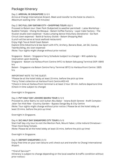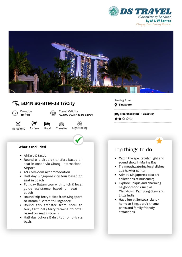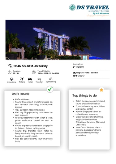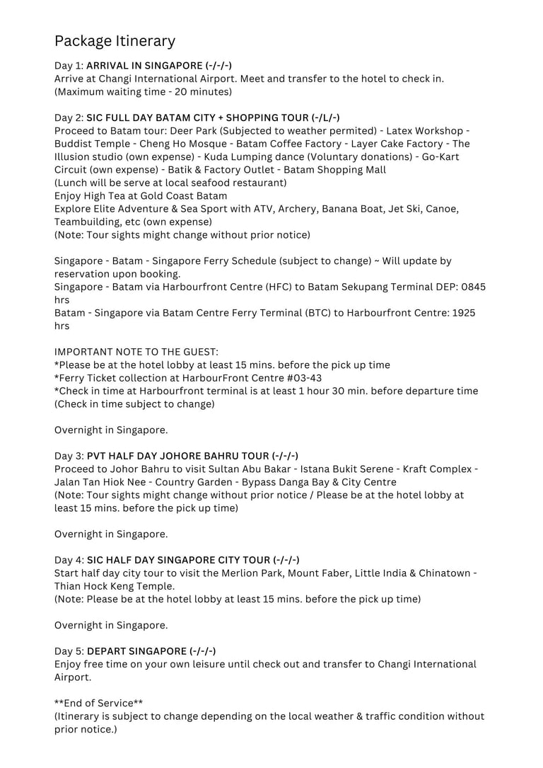 Enjoy hopping to 3 cities from the melting pot of Southeast Asia, Singapore - Travel and shop in Batam, Indonesia, enjoy a city tour in Johor Bahru, Malaysia.