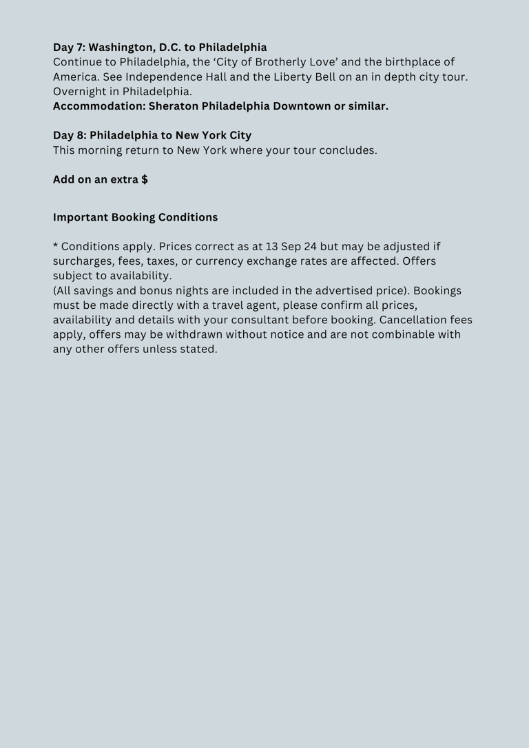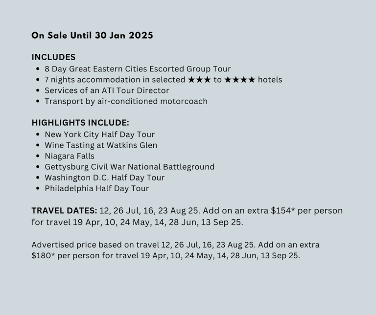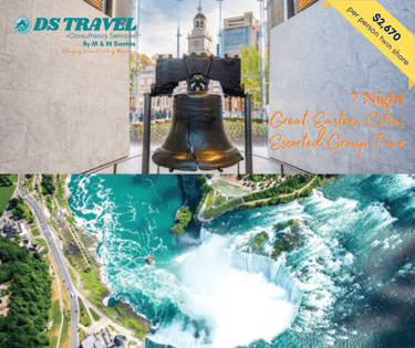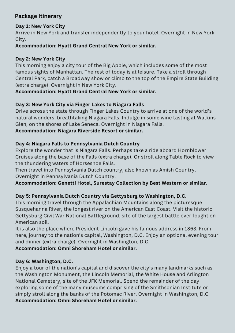 Explore the USA's most inspiring locations, starting in New York City, visiting Niagara Falls, Pennsylvania Dutch Country, Gettysburg Civil War National Battleground, Washington D.C. landmarks, Philadelphia, and New York City.