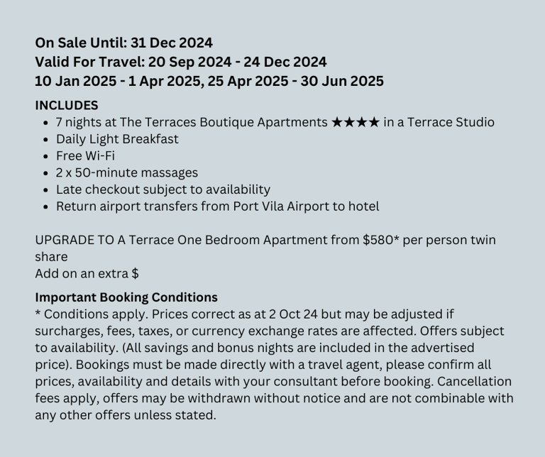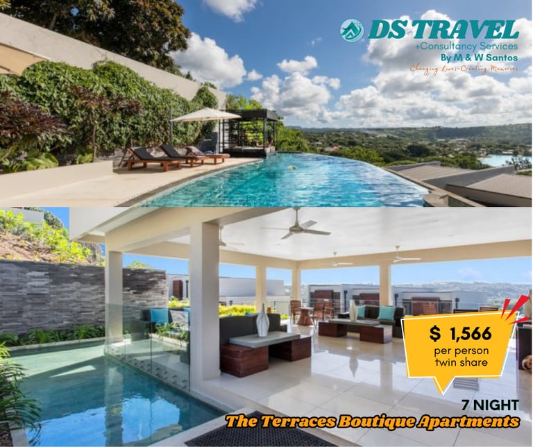 The Terraces Port Vila offers a variety of studio, one-bedroom, and two-bedroom apartments, accommodating up to five guests. The clifftop location offers stunning views of tropical rainforest and Erakor Lagoon, providing endless opportunities to explore and unwind.