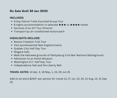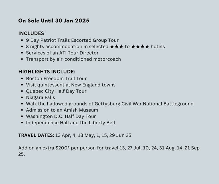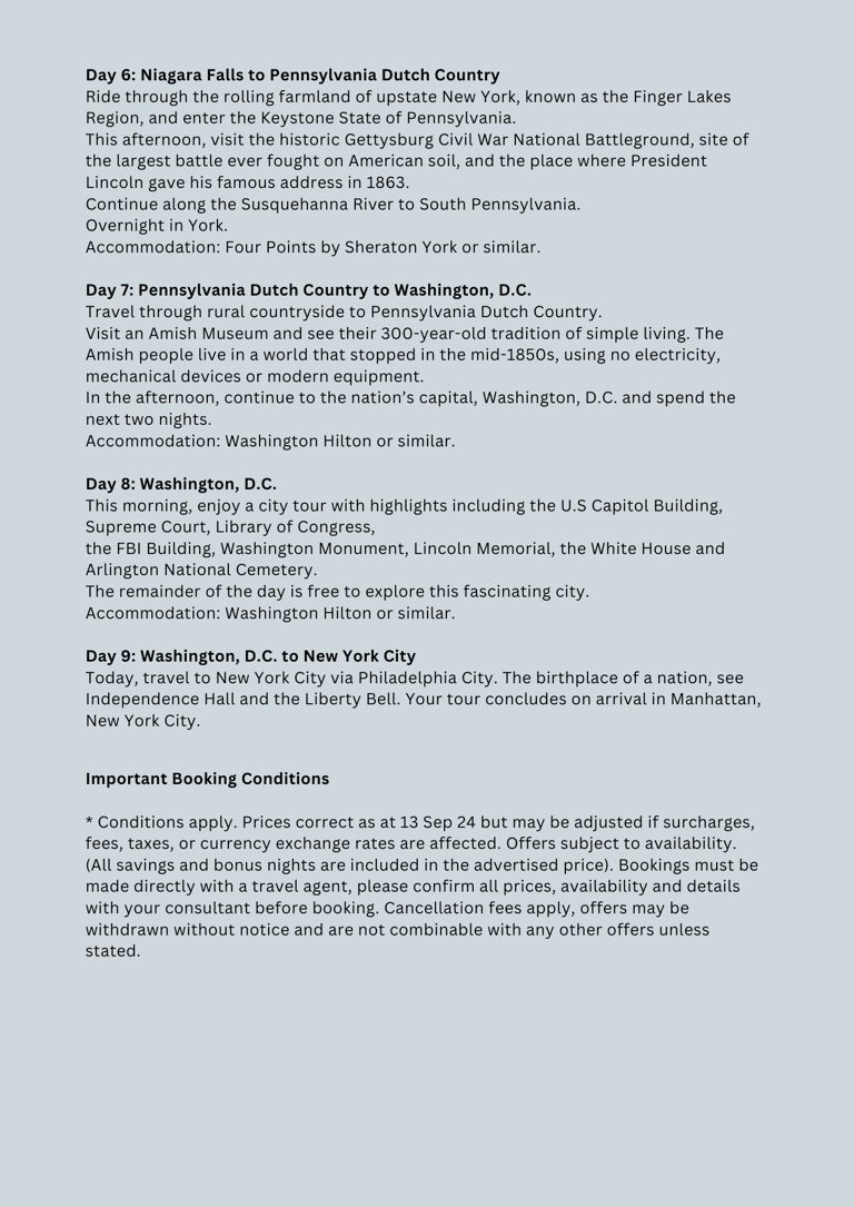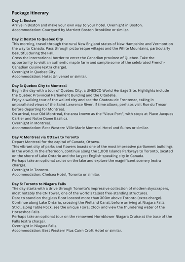 Start your journey in Boston, then head to Canada, visiting Quebec City, Montreal, Toronto, Niagara Falls, Gettysburg, Pennsylvania Dutch Country, Washington D.C., and New York City.