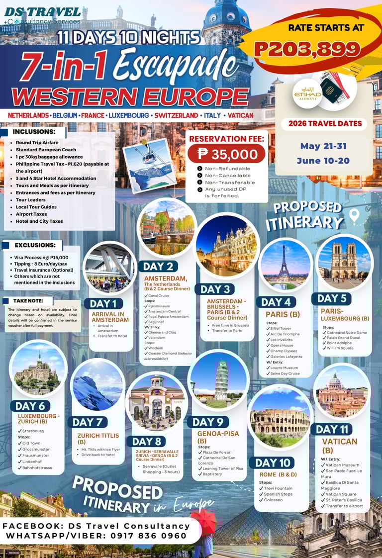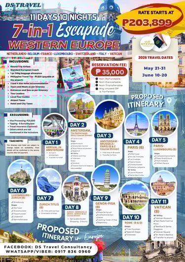 Explore the canals of Amsterdam, the medieval beauty of Bruges, the romantic highlights of Paris, the scenic charm of Luxembourg City, the historic elegance of Berlin, the breathtaking Alps in Lucerne, and the timeless wonders of Rome. This 7-in-1 tour offers the perfect mix of culture, history, architecture, and unforgettable European scenery.